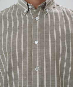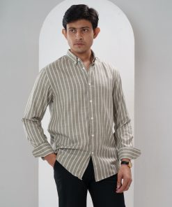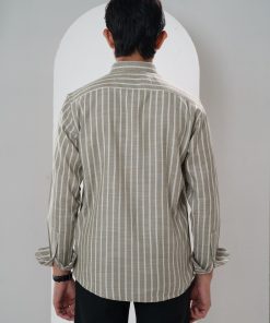 The ELEMENT Light Olive Striped Shirt features a soft light-olive base enhanced with clean vertical white stripes. Crafted from 100% cotton with a 170–180 GSM weight, it ensures breathable comfort with a structured, refined look — perfect for elevated casual or semi-formal styling.