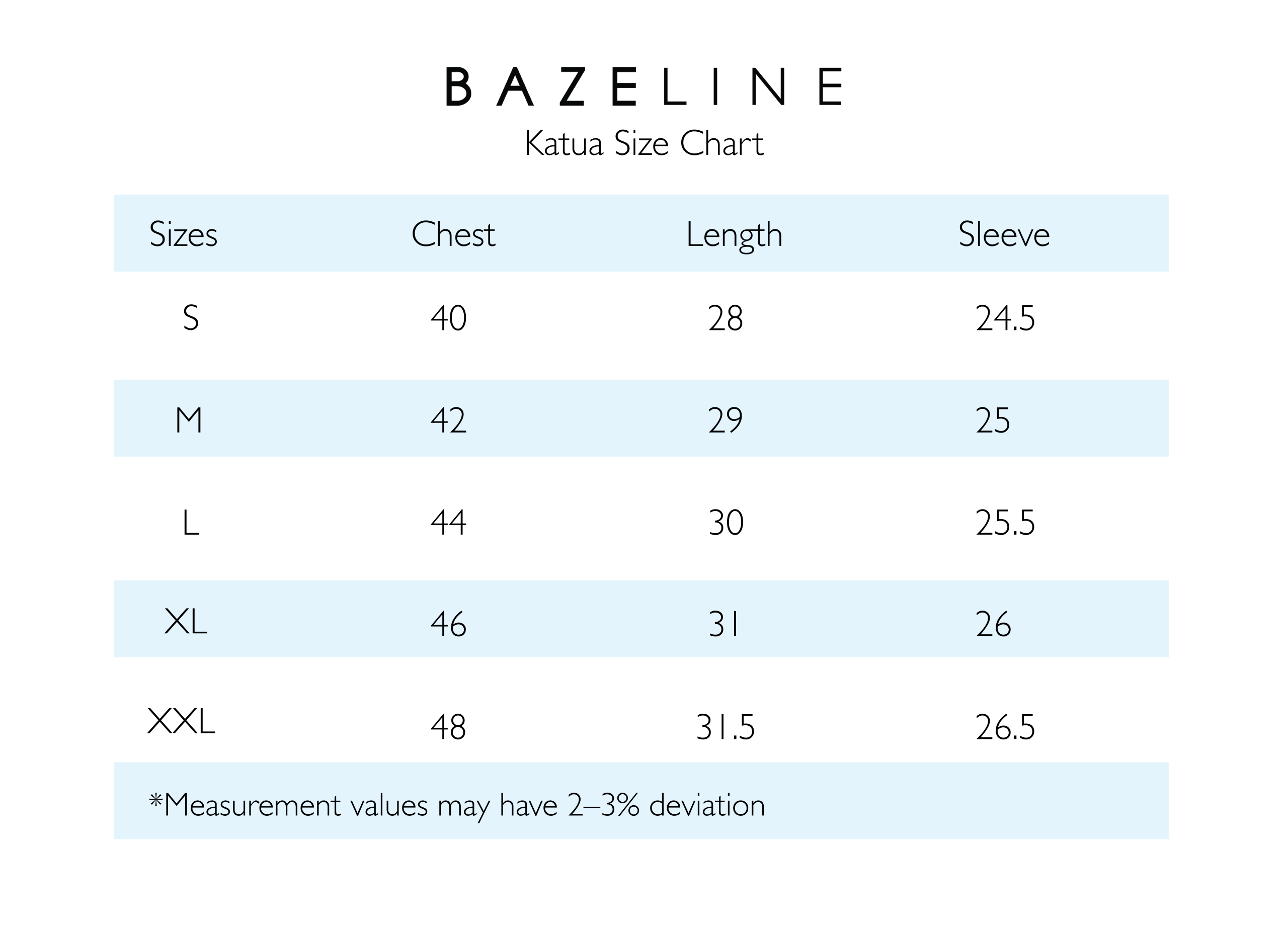 | Size | Chest (in) | Length (in) | Sleeve (in) |