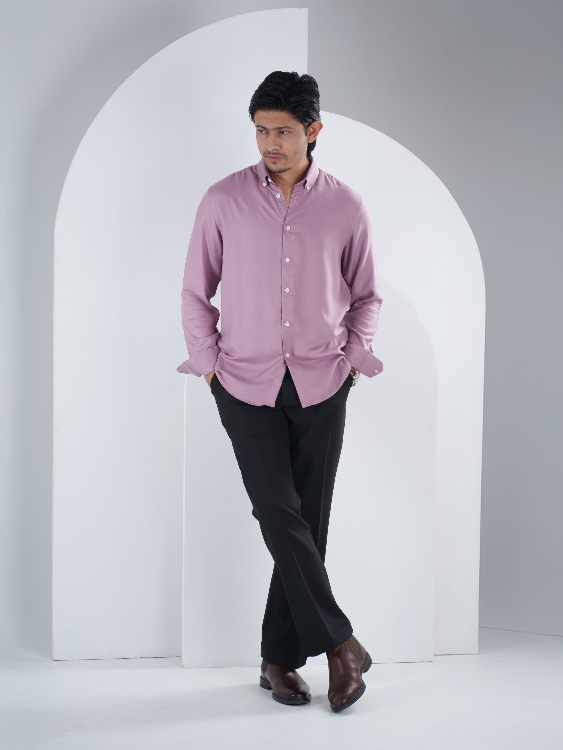 The NOVA Dusty Rose Herringbone Shirt is a standout piece that redefines modern sophistication. Crafted with a distinctive V-shaped herringbone weave, the blending of Dusty Rose and White yarns creates a unique, muted pinkish-mauve appearance. This textured fabric offers a rich handfeel and a structured drape that is both durable and stylish for any occasion.