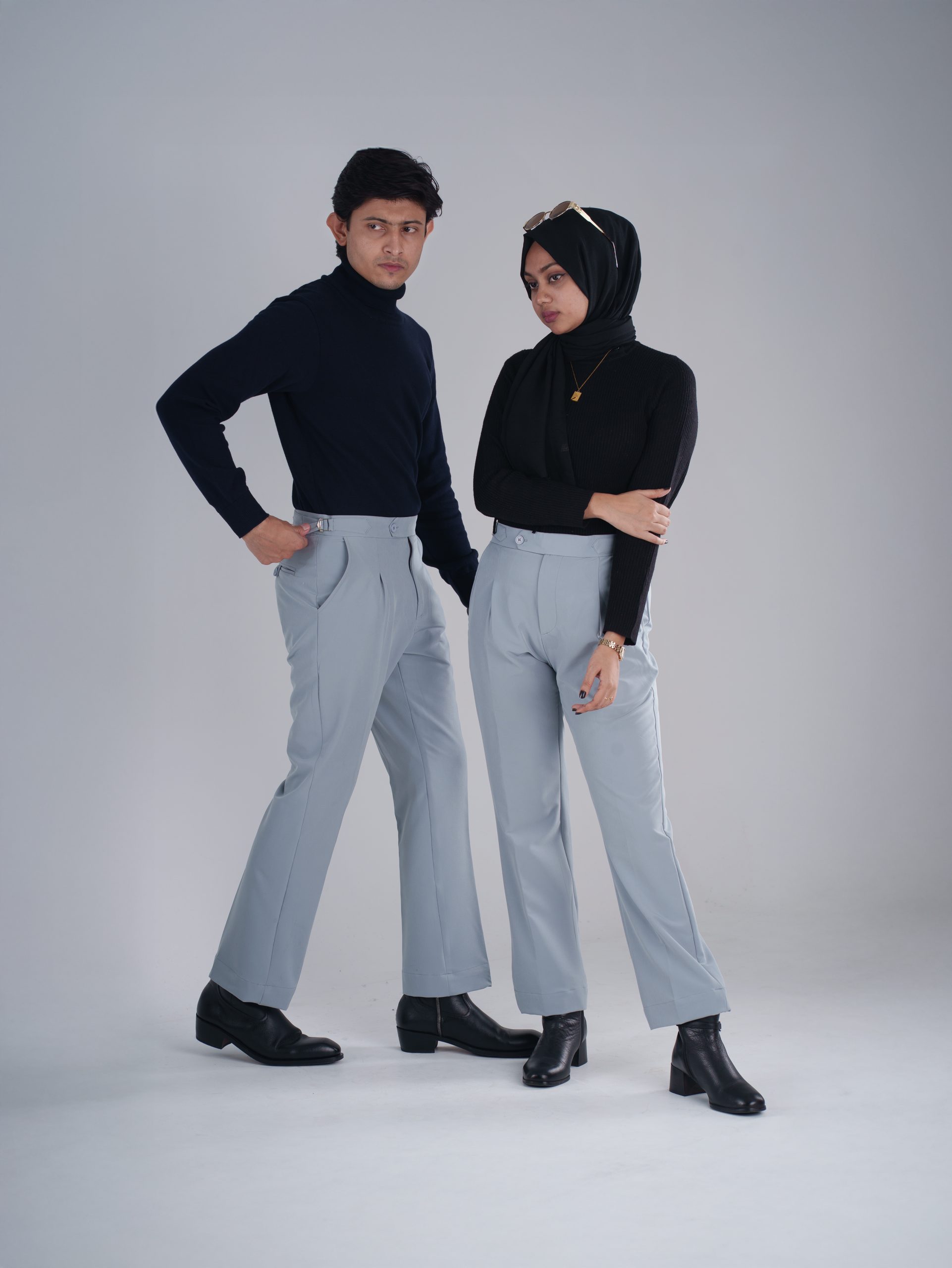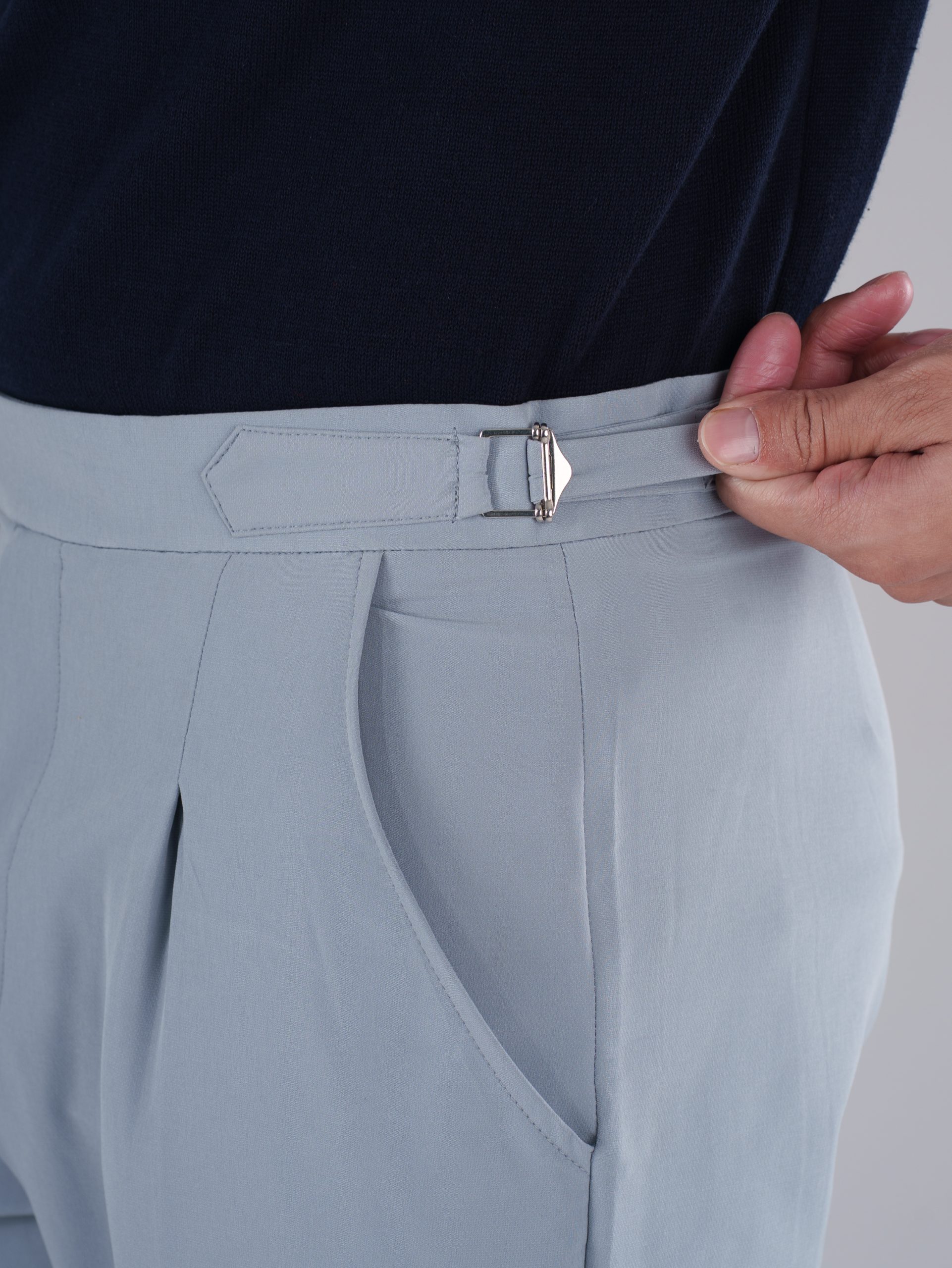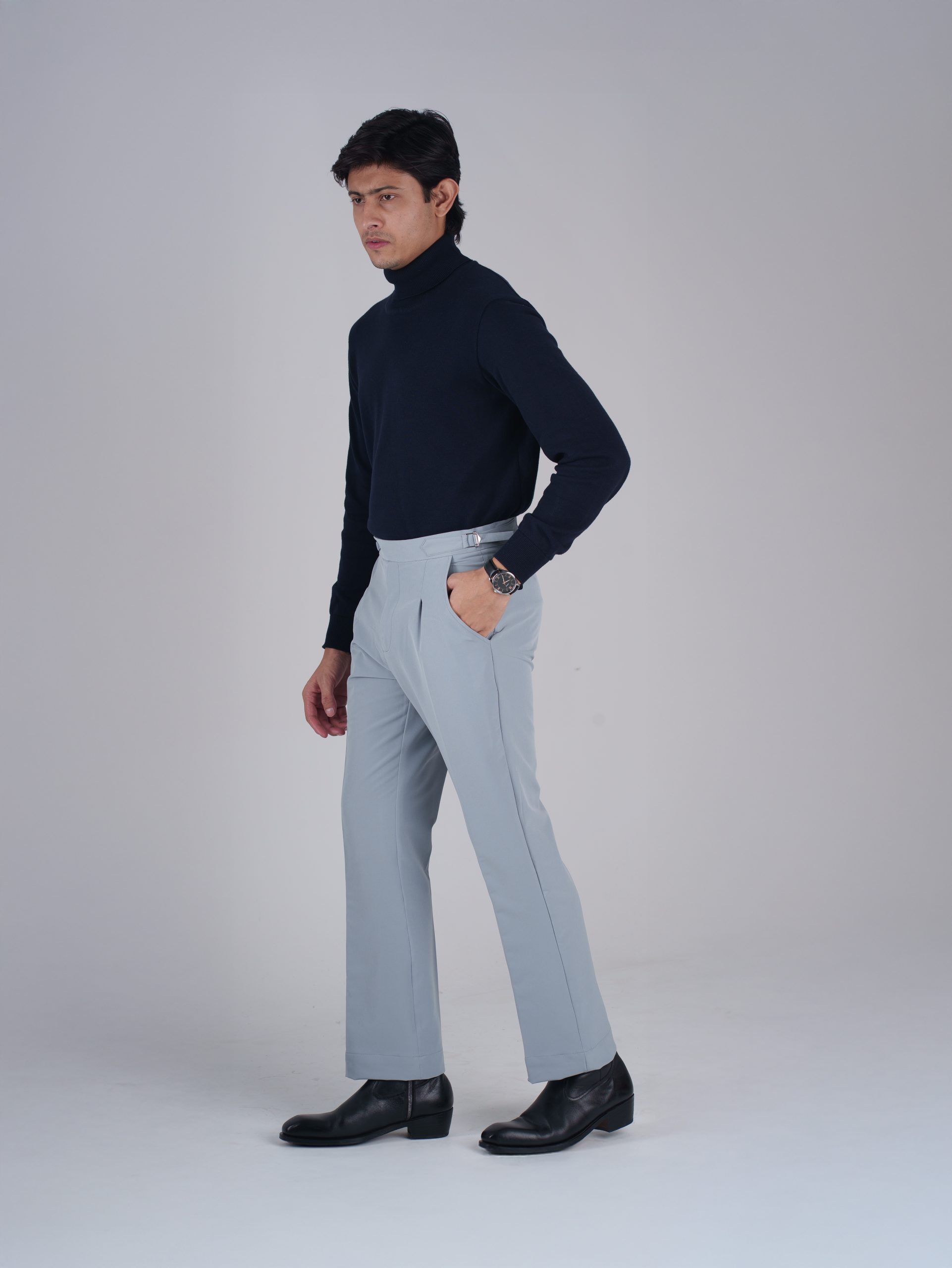 A premium Gurkha bootcut pant crafted from stretchable dobby fabric, combining classic tailoring with modern comfort for versatile everyday wear.