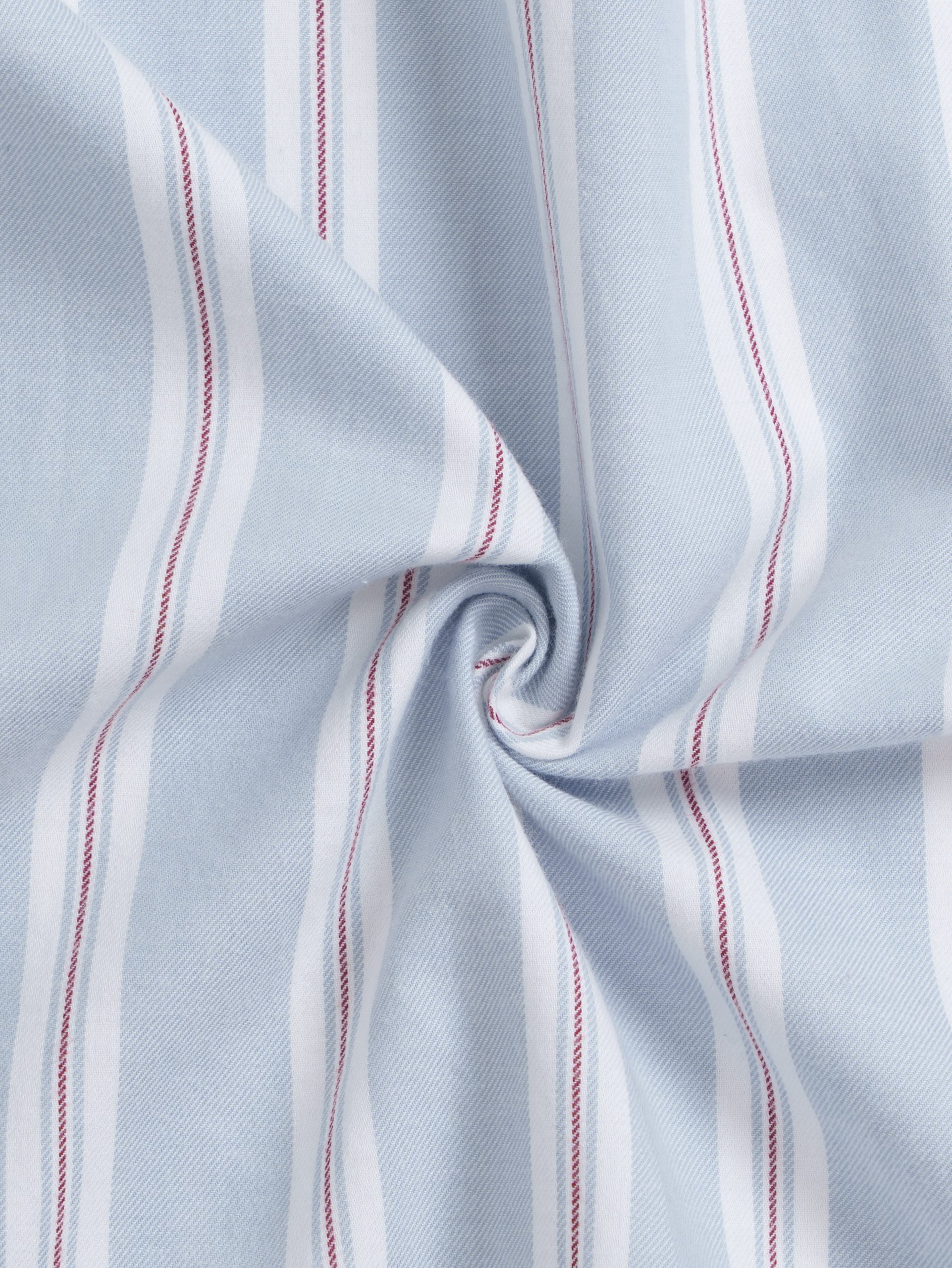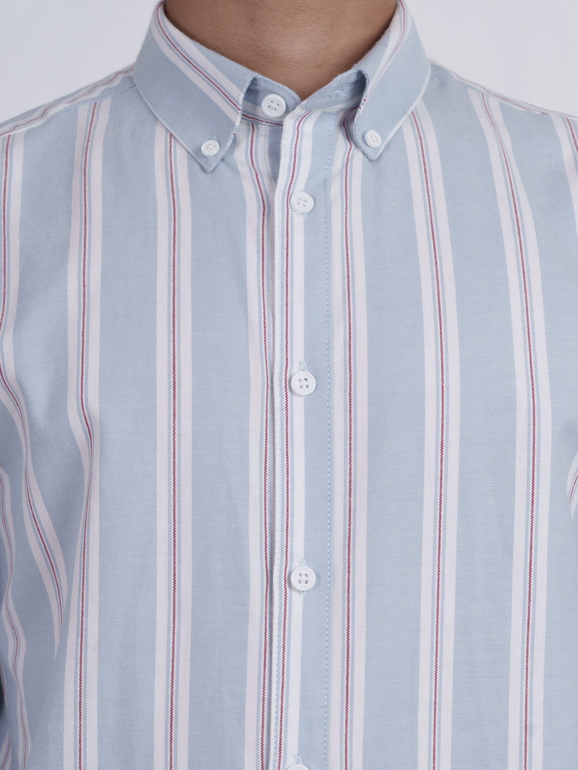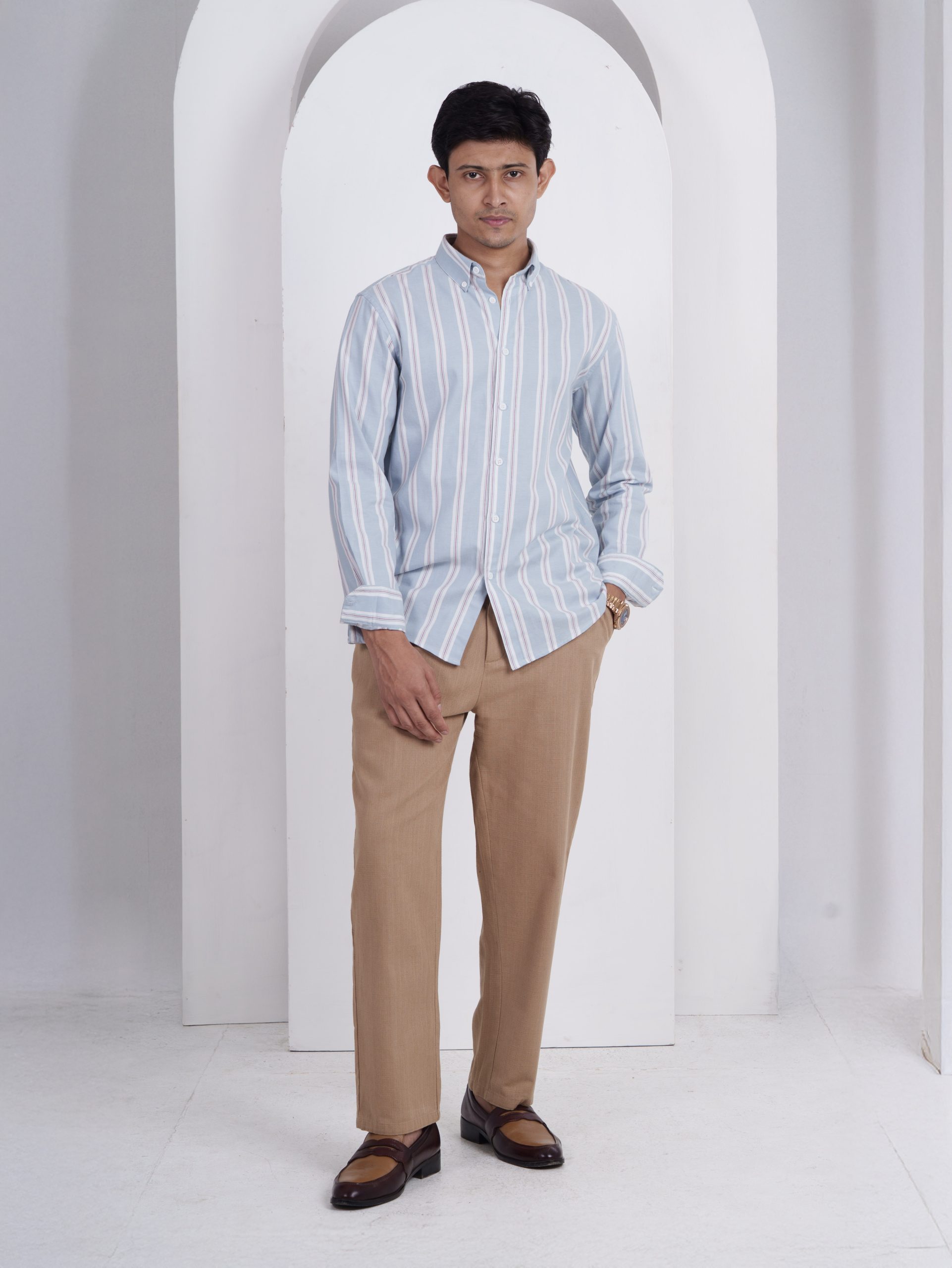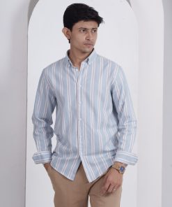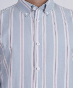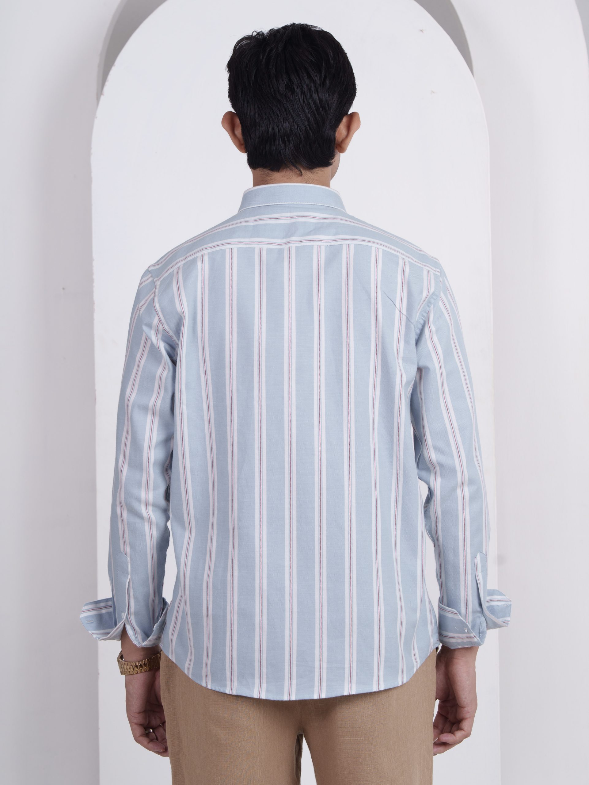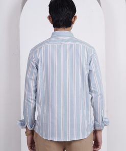 From the SOLACE Collection — a twill cotton shirt in sky blue with white and brick-red stripes, designed for breathable comfort and timeless appeal.