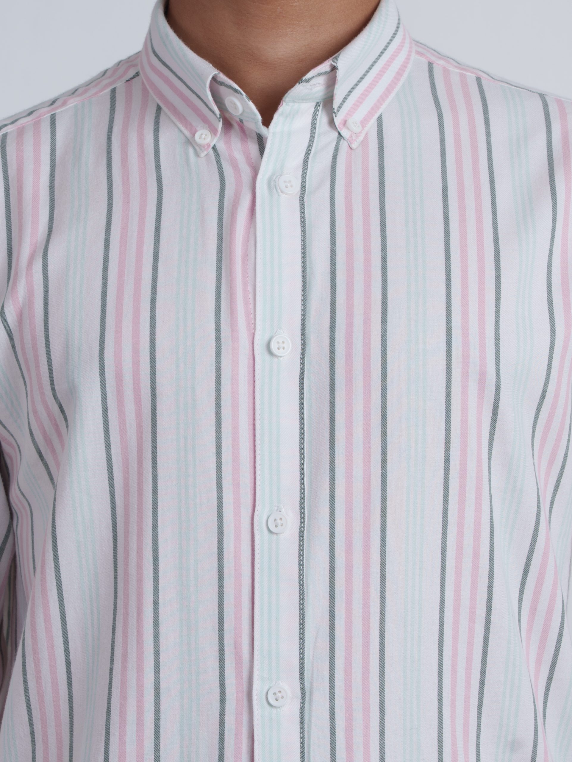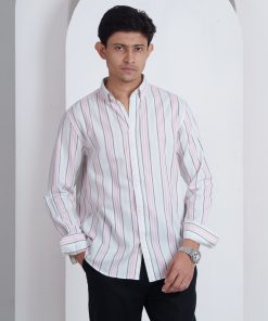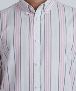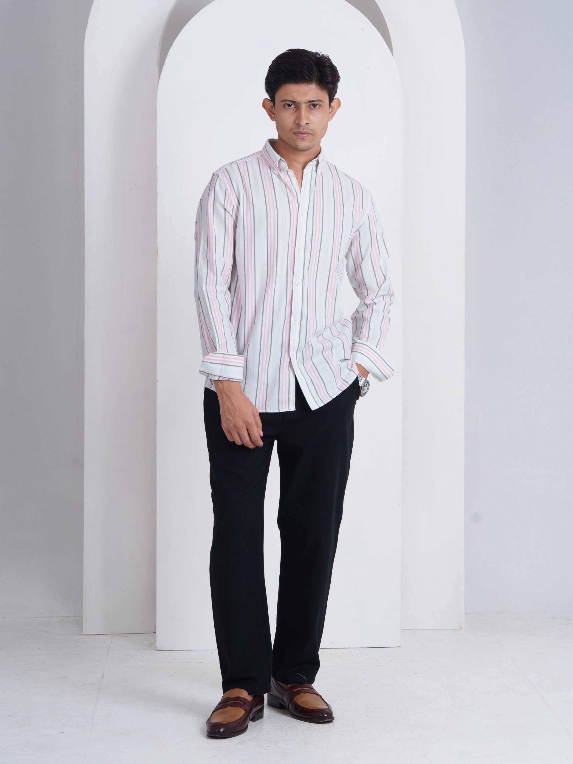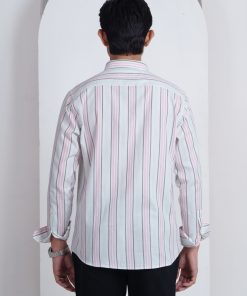 The SOLACE White Multi Striped Shirt embodies clean sophistication with a touch of soft color. Crafted from 100% cotton in a fine twill weave, this 165 GSM fabric balances breathability with a crisp, structured feel. The pure white base is elevated by pastel pink, mint, and grey woven stripes — giving it a refined yet refreshing look perfect for both casual and semi-formal occasions.