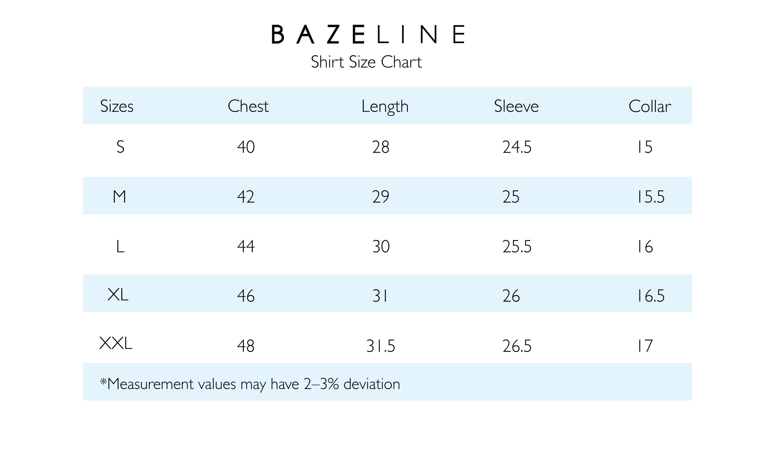 Sizes Chest Length Sleeve Collar